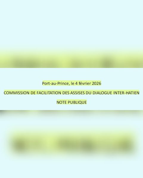 Port-au-Prince, 4 février 2026. La Commission de facilitation des Assises du Dialogue Inter-Haïtien a rendu publique une note informant la classe politique, les secteurs organisés, la population et la communauté internationale de l’issue des consultations menées du 1er au 3 février 2026. Ces consultations font suite au dialogue inter-haïtien organisé du 18 au 21 janvier 2026, qui a réuni une centaine de plateformes sociales et politiques représentant plusieurs centaines de partis et des milliers d’organisations de la société civile.
